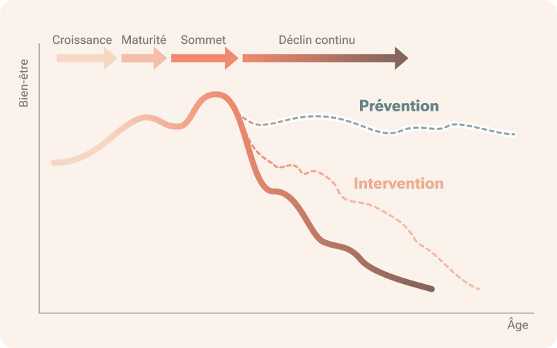 Le moment est venu d’évaluer vos biomarqueurs afin de repérer les facteurs de risques, mieux comprendre vos habitudes de vie et renforcer la prévention. Ajuster votre alimentation, augmenter votre masse musculaire, commencer ou ajuster votre hormonothérapie et mieux gérer votre stress sont des actions qui pourront vous aider dès maintenant. En plus, elles vous protégeront contre les maladies chroniques, en vous gardant forte et autonome pour les années à venir.